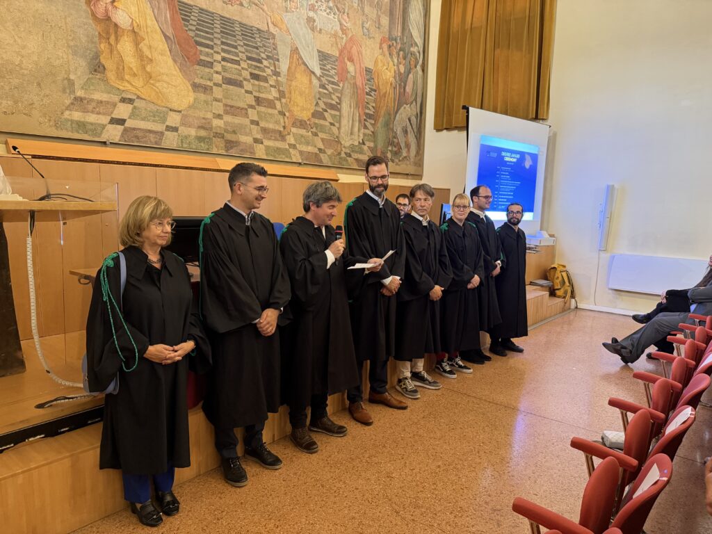 On the first day, the 31 students defended their theses in front of the three Degree commissions at Department of Physics and Astronomy “Augusto Righi” composed of: Prof. Kevin Kröninger (TU Dortmund), Prof. Sarah Porteboeuf (University of Clermont Auvergne), Prof. Maximiliano Sioli (University of Bologna), Prof. Angelo Carbone (University of Bologna), Dr. Andrea Knue (TU Dortmund), Prof. Romain Madar (University of Clermont Auvergne), Dr. Fabio Ferrari (University of Bologna), Prof. Federica Fabbri (University of Bologna), Prof. Stephane Monteil (University of Clermont Auvergne), Prof. Emmanuel Stamou (TU Dortmund).
