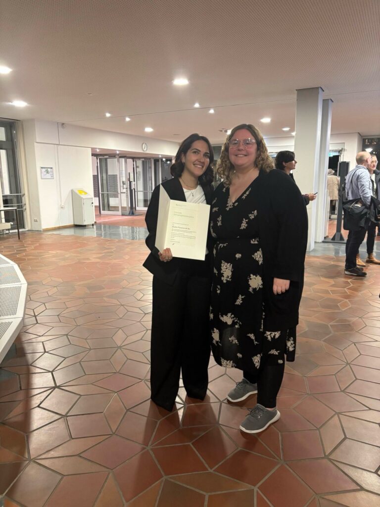 Giulia received the prize for her thesis “Suppressing pile-up contributions in the formation of topological clusters in ATLAS”, written under the supervision of Dr. Chris Malena Delitzsch (with her in the photo) during her fourth semester at TU Dortmund.